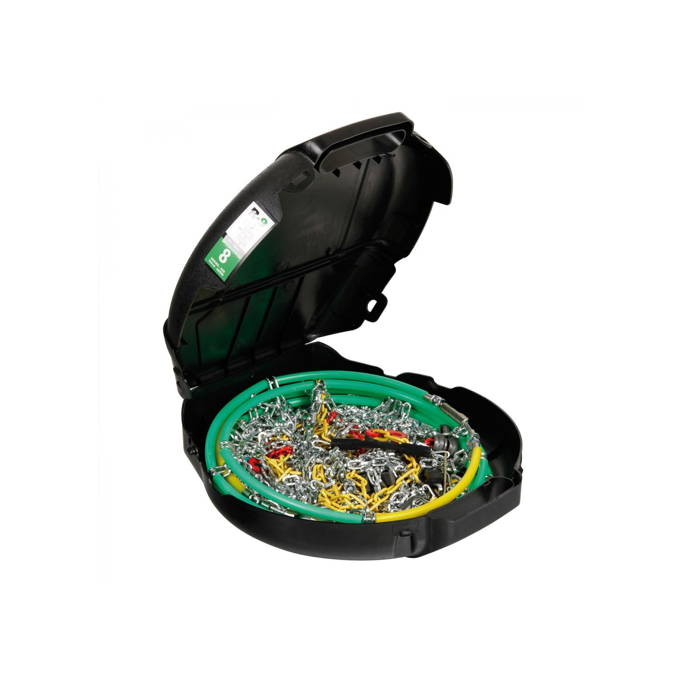 Priamo na reťazi je na zelenom štítku vyrazený rozmer reťazí. Veľmi praktické v prípade, že stratíte obal a aplikačný list