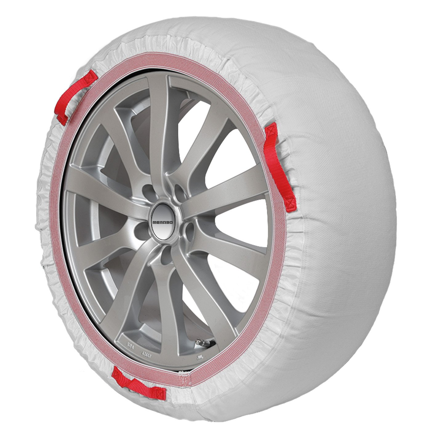 Textilné snehové reťaze Menabo SNOW SOCKS sú praktickou alternatívou ku klasickým kovovým reťaziam. Zlepšujú trakciu na zasnežených cestách a pomáhajú pri bezpečnejšom rozbiehaní a brzdení na čerstvom aj ušlapanom snehu. Vďaka jemnej, ale odolnej textílii sú výrazne šetrnejšie k diskom aj podvozkovým častiam než kovové reťaze a zároveň sú oveľa jednoduchšie na manipuláciu. Biely návlek s červeným vystuženým lemom a praktickými pútkami umožňuje rýchle nasadenie aj zloženie – návlek stačí natiahnuť na pneumatiku, s vozidlom sa posunúť o polovicu otáčky a dotiahnuť zvyšok. Elastický okraj zabezpečí, že textília na pneumatike dobre drží pri jazde nízkou rýchlosťou. Textilné reťaze Menabo sú homologované podľa normy EN 16662-1, takže vo väčšine krajín EÚ (s výnimkou Rakúska) môžu byť akceptované ako náhrada kovových reťazí aj pri dopravnom značení vyžadujúcom snehové reťaze. Sú vhodné pre osobné vozidlá, crossovery, SUV a ľahké dodávky do 3 400 kg vybavené ABS. Maximálna odporúčaná rýchlosť je 50 km/h.